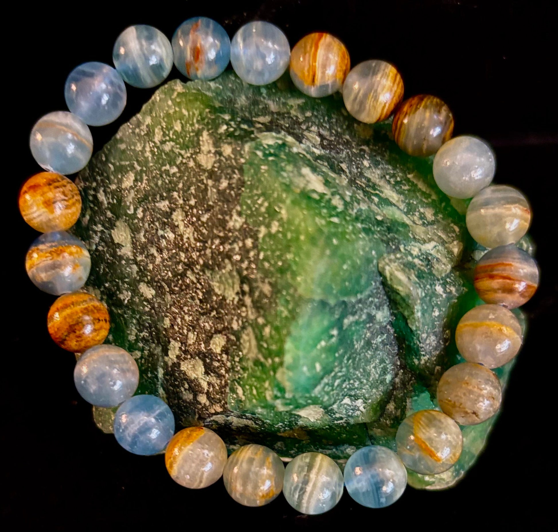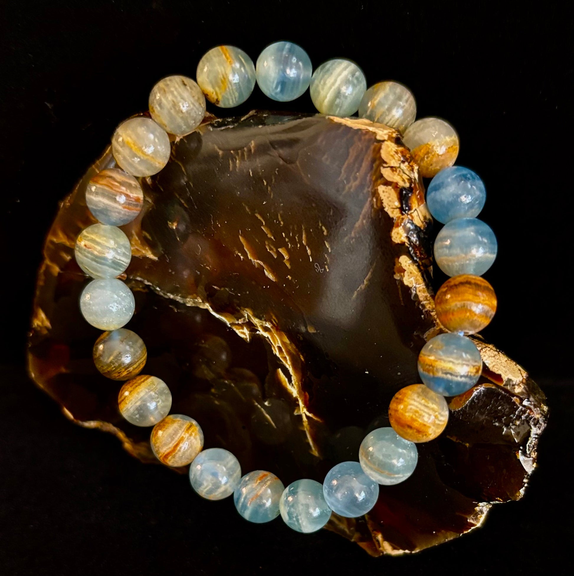 Dive into the calming energy of Aquatine Lemurian Calcite, a rare and mesmerizing stone with swirls of oceanic blues, earthy browns, and ethereal translucence. This 7.5โ stretch bracelet is handcrafted with polished 8mm beads, offering a serene and grounded energy thatโs perfect for daily wear.