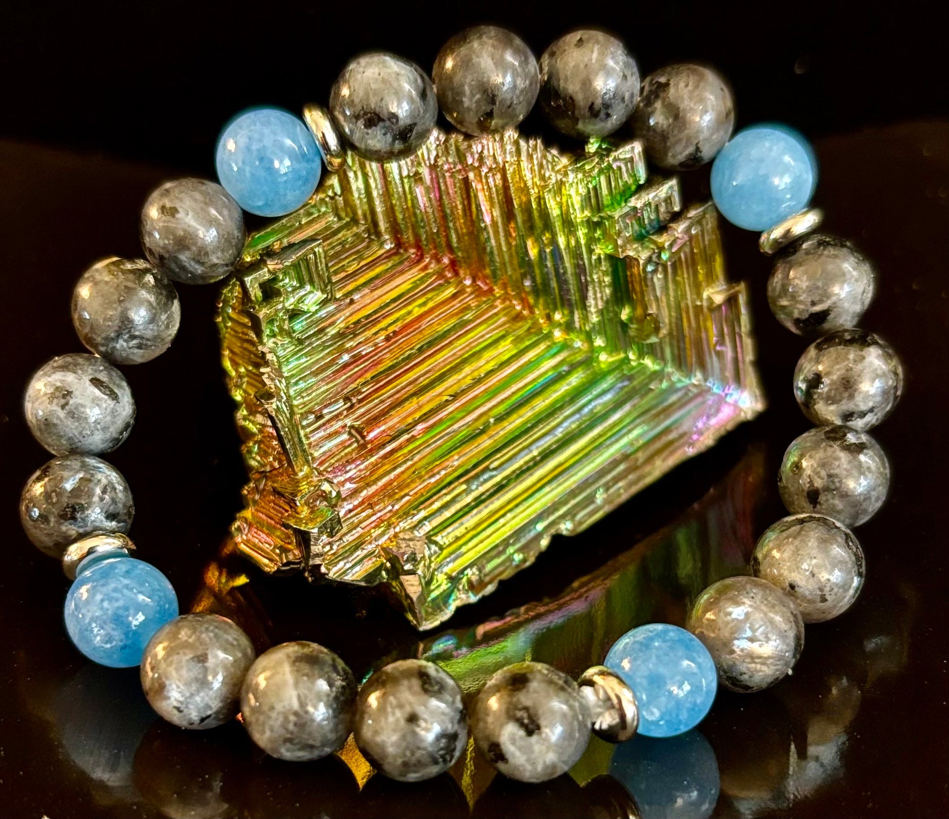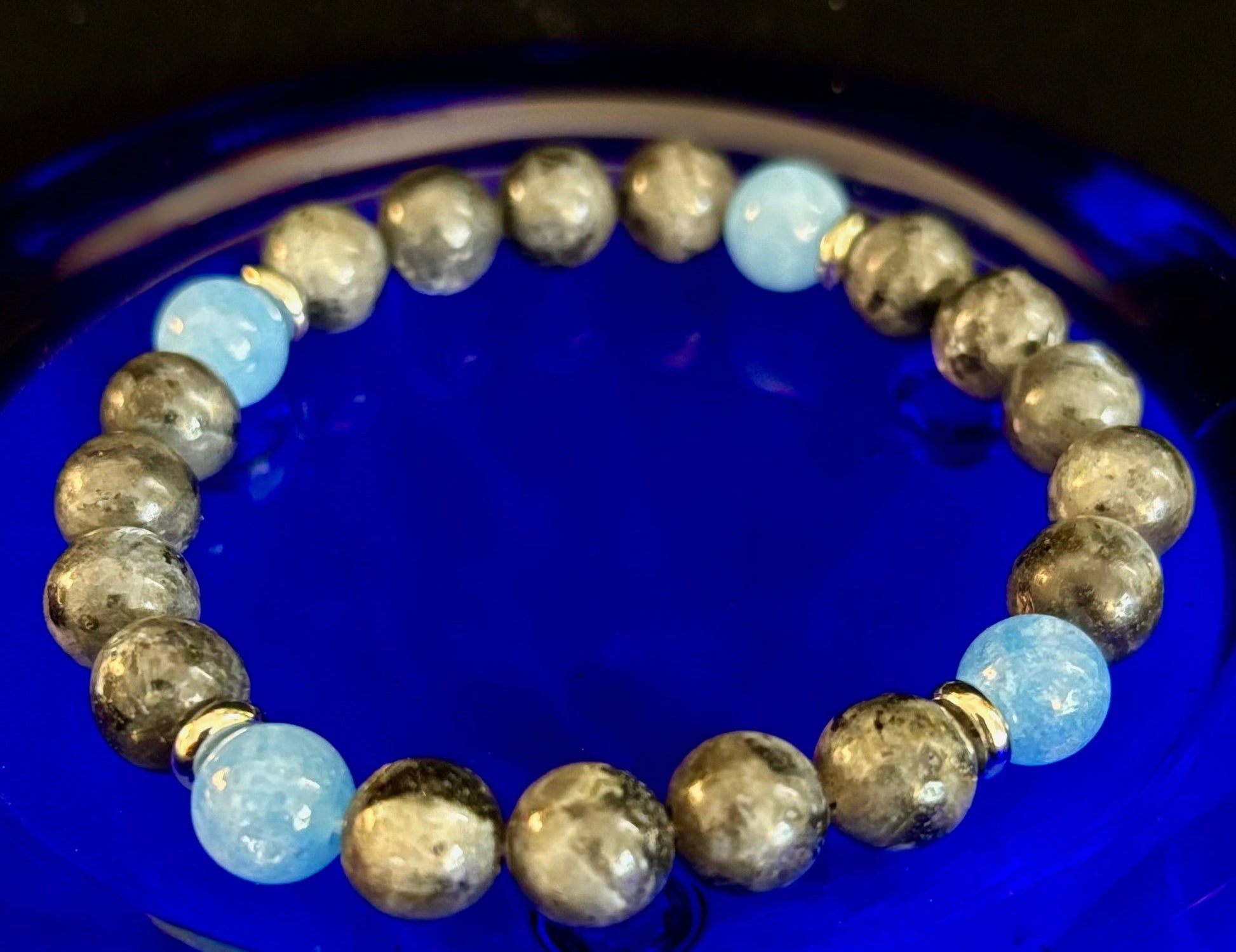Ground your energy and soothe your spirit with this stunning Black Labradorite & Aquamarine Beaded Bracelet, thoughtfully handcrafted for medium-sized wrists. This bracelet pairs the protective strength of labradorite with the calming essence of aquamarine, making it a powerful ally for emotional balance, intuitive growth, and spiritual alignment.