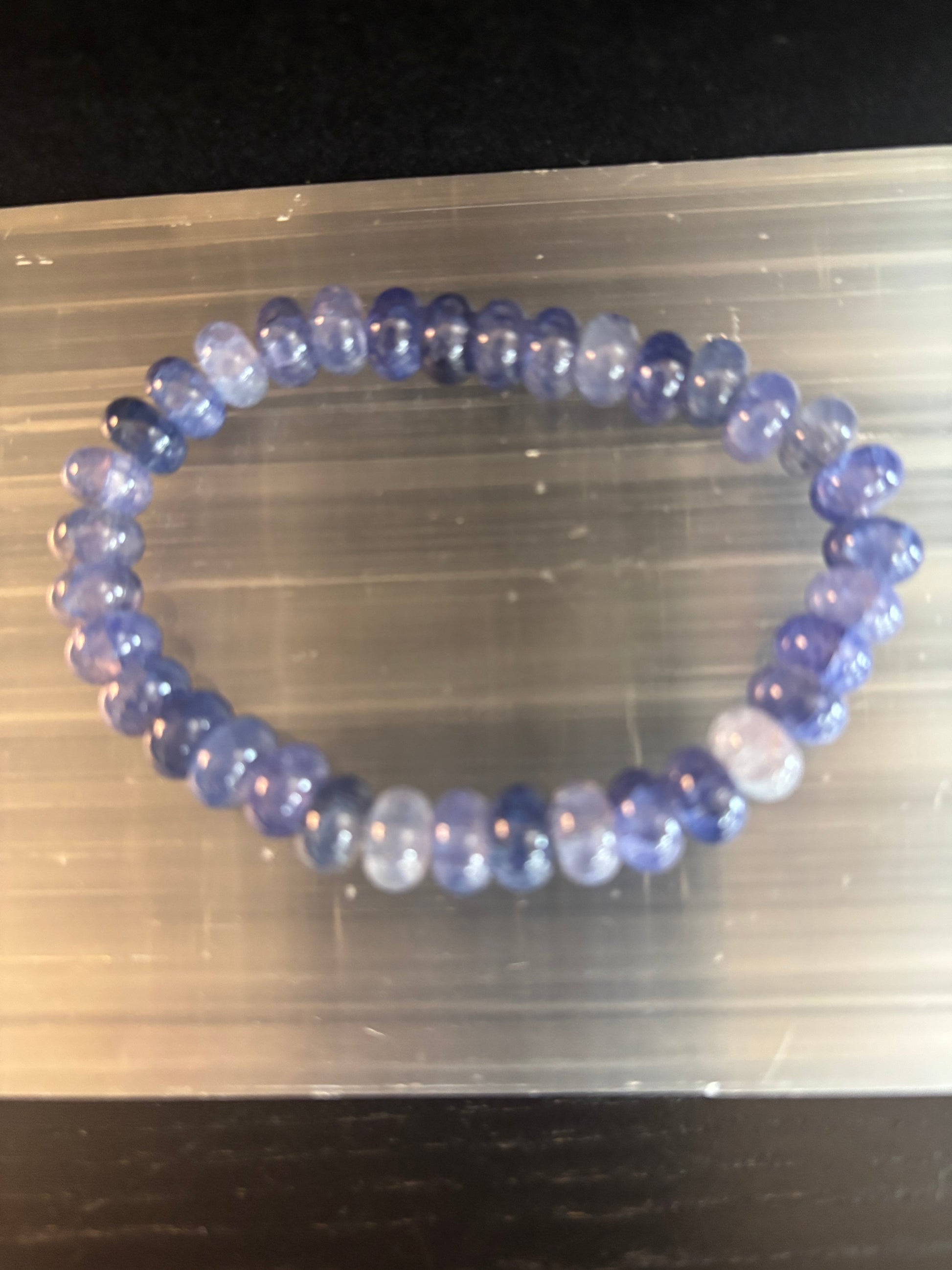 Embrace calm and connect with your inner wisdom through the soothing energy of our Blue Agate Bracelet, featuring beautifully faceted rondelle beads that shimmer in shades of deep blue and soft violet. Designed with a stretch fit, this bracelet comfortably suits small to medium wrists, offering both style and spiritual support.