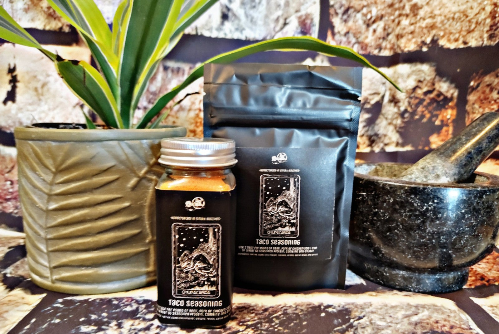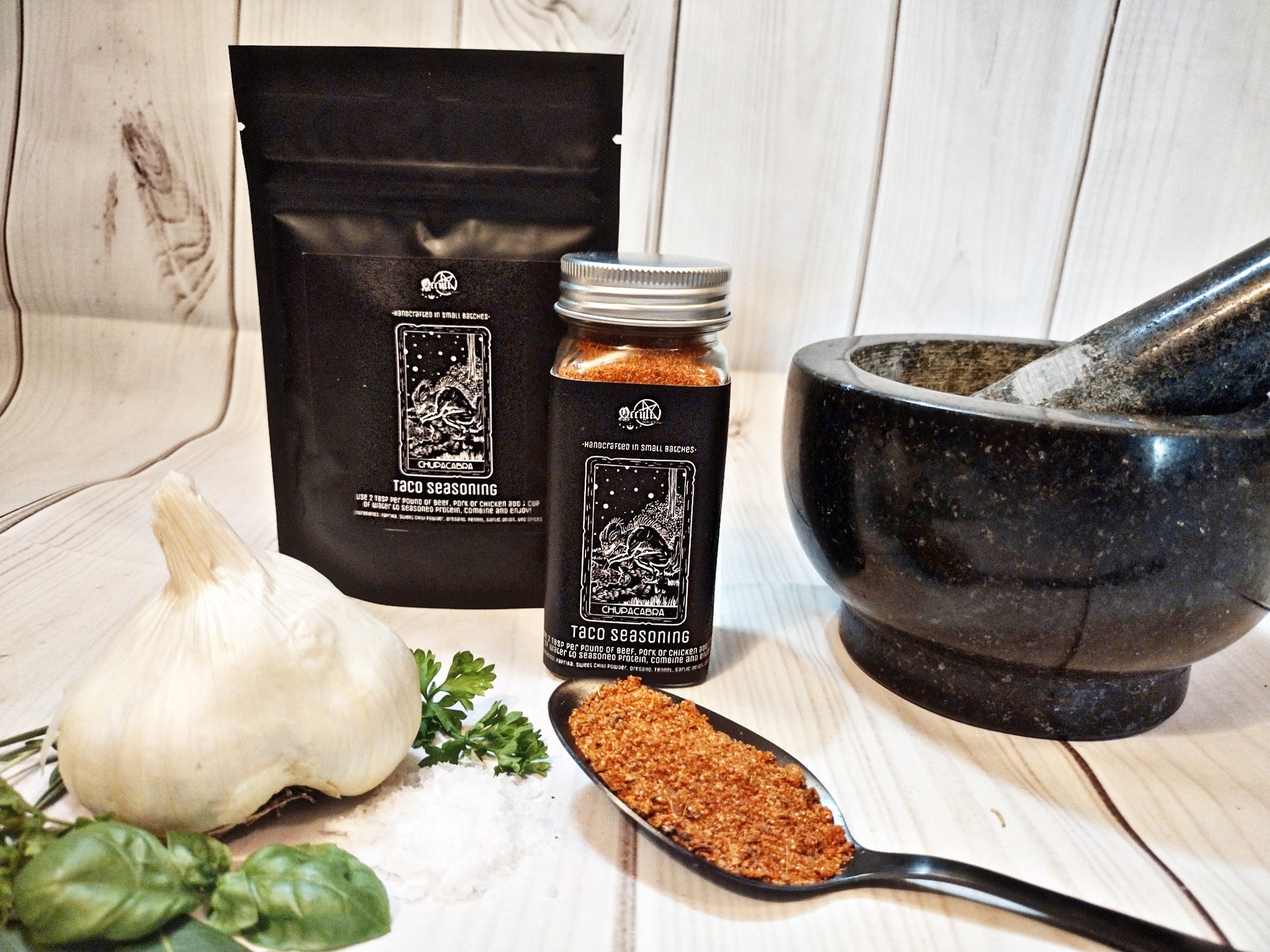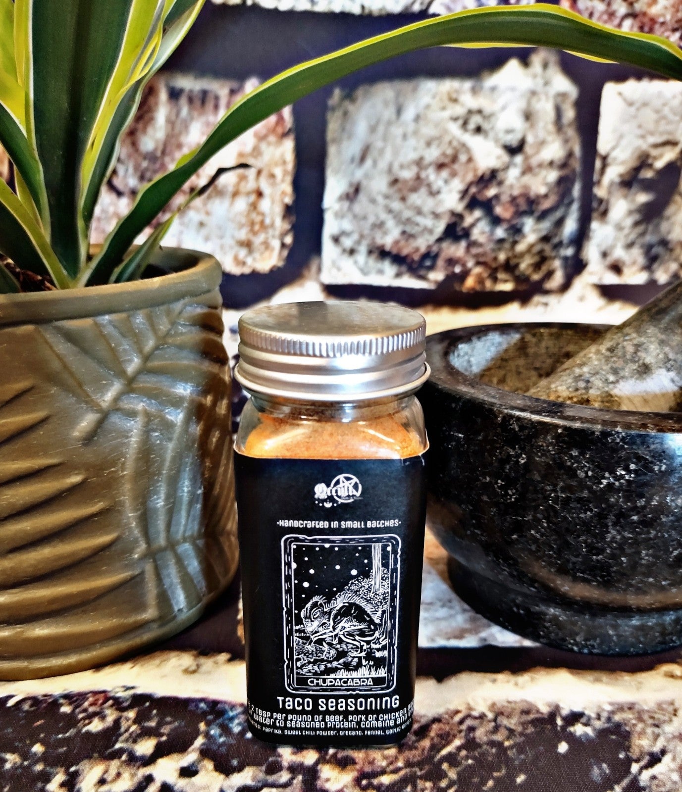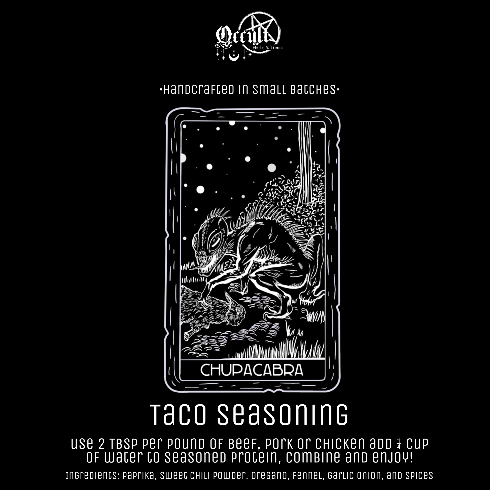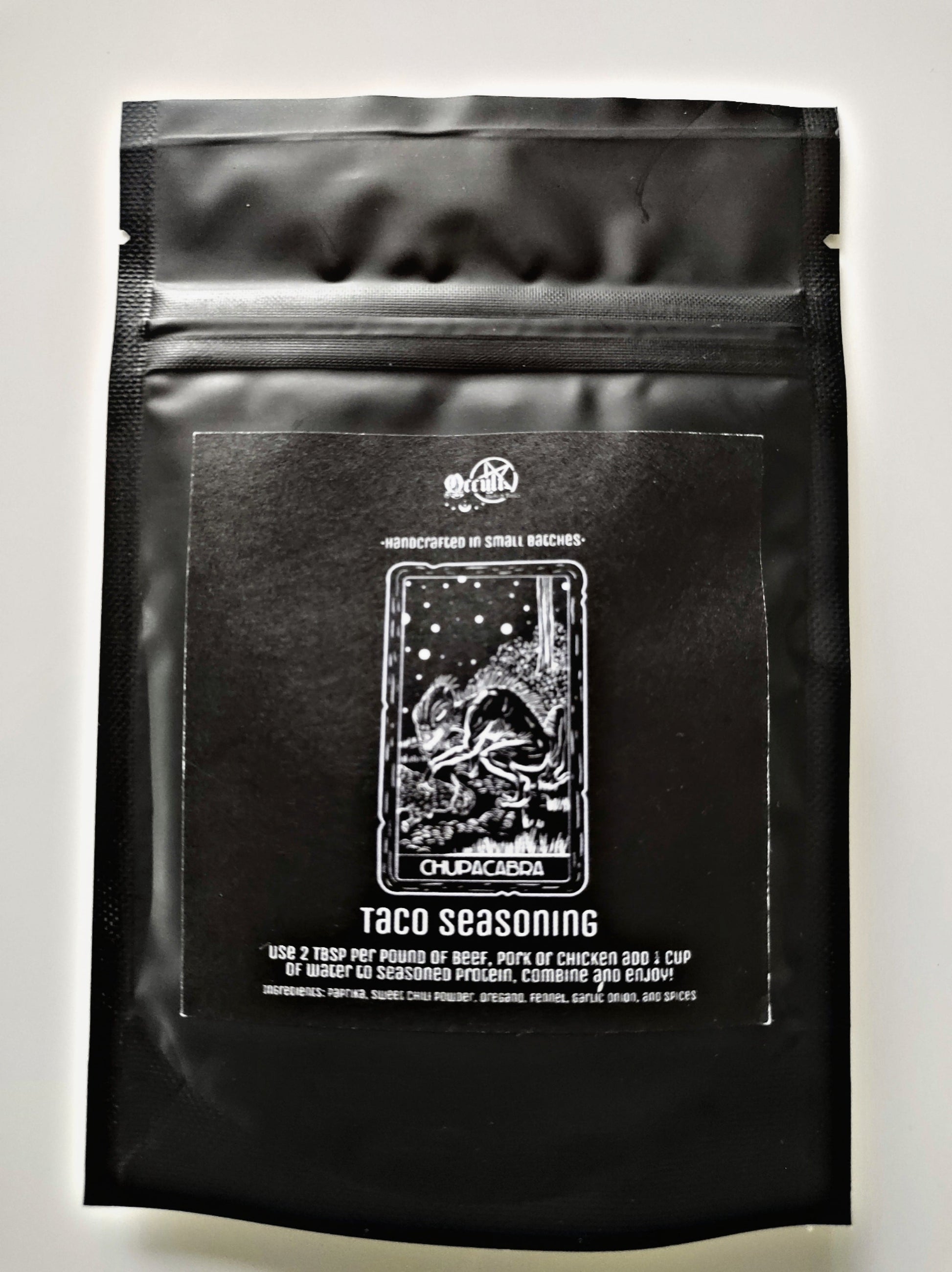 Introducing our newest addition to the Occult Spice family, The Chupacabra, our Taco Seasoning blend. Complete with a smoky sweet paprika. chili powder. oregano, fennel and more. Add 2 Tbsp and 1/4 cup of water to a pound of shredded chicken, pork, or beef. Available in 2oz. 8oz, and 16oz resealable pouches,