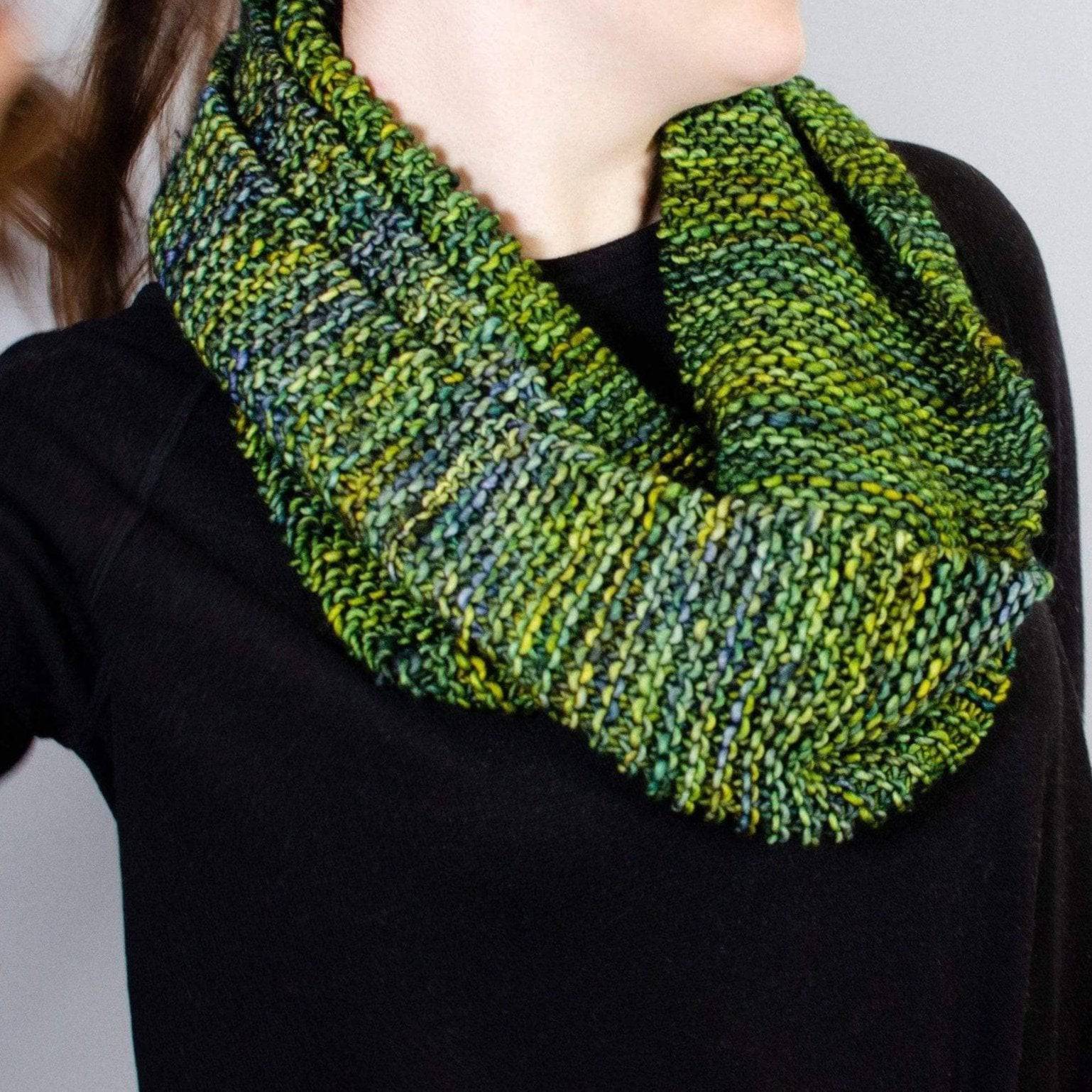 The Green Goddess Infinity Scarf comes with two patterns: one basic garter stitch cowl and another intermediate bobble pattern. 2 skeins of Malabrigo are required for each pattern. Allow the yarn to show it's true beauty through these scarves!