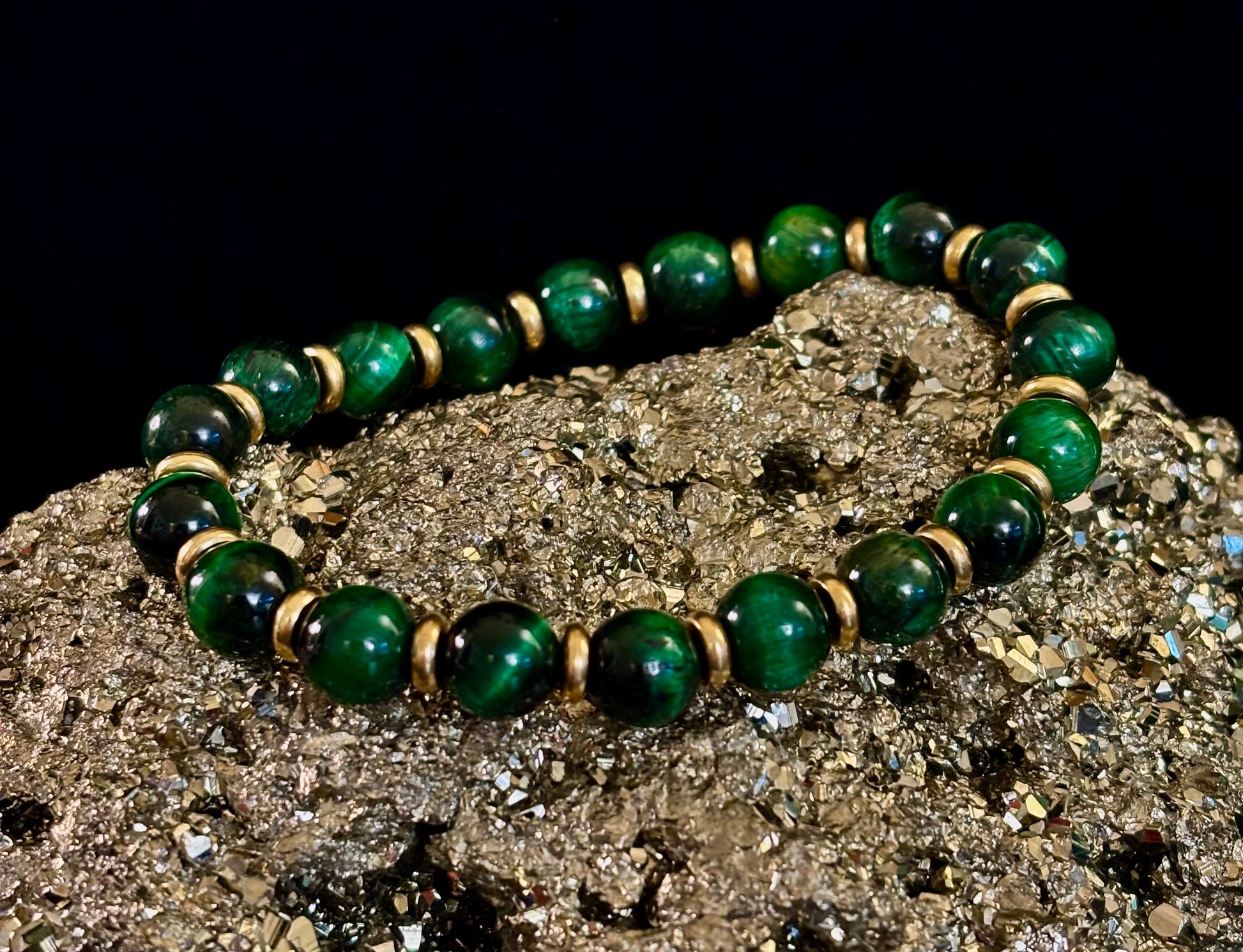 Tap into the vibrant power of abundance and clarity with our Green Tiger Eye Wealth & Confidence Bracelet. Handcrafted with 8mm natural green tiger eye beads and finished with elegant gold-toned spacers, this unisex bracelet blends style with spiritual intention.