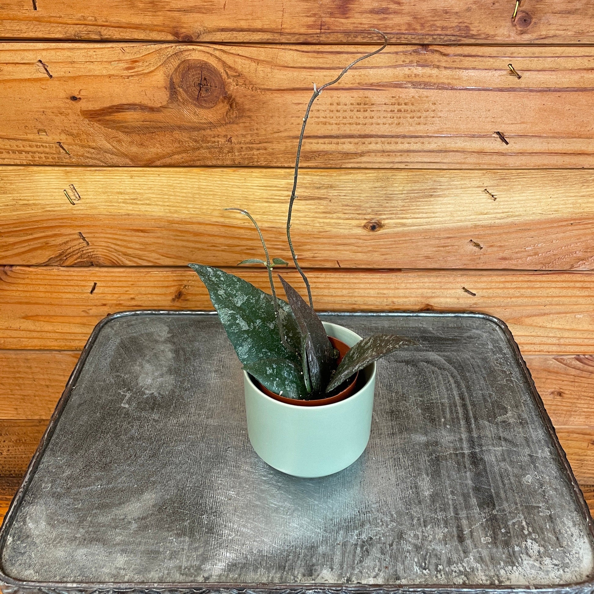 This plant has beautiful burgundy leaves. Hoyas make beautiful houseplants and when cared for properly they bloom parachute clusters of star-shaped flowers with five-point centers like nothing else!
