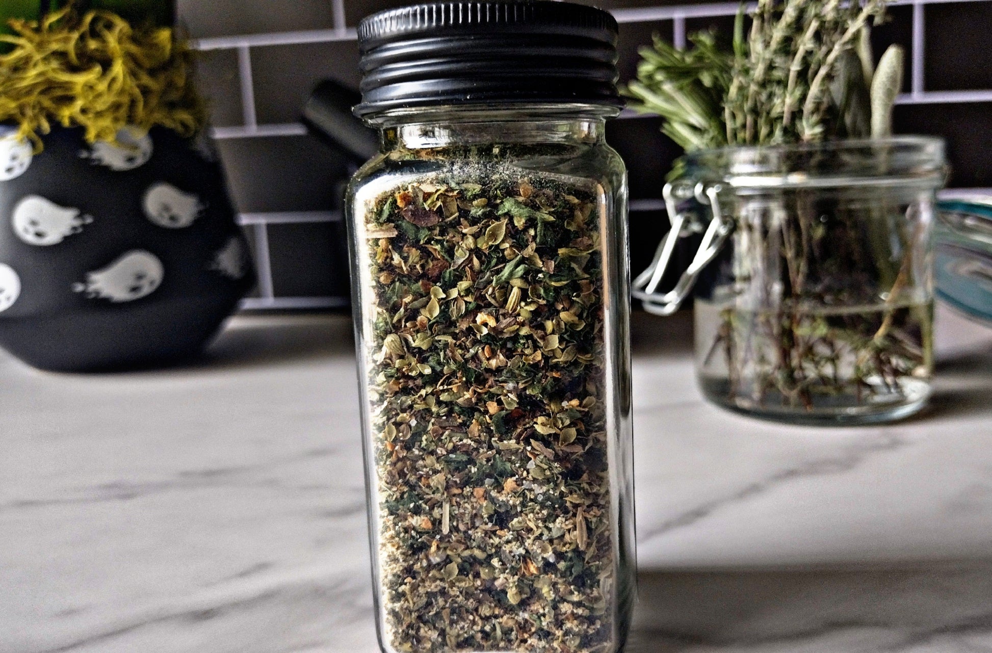 Ingredients include: Greek Oregano, parsley, onion, garlic, mint, basil, fennel, dill, tangerine peel, black pepper and fine sea salt.