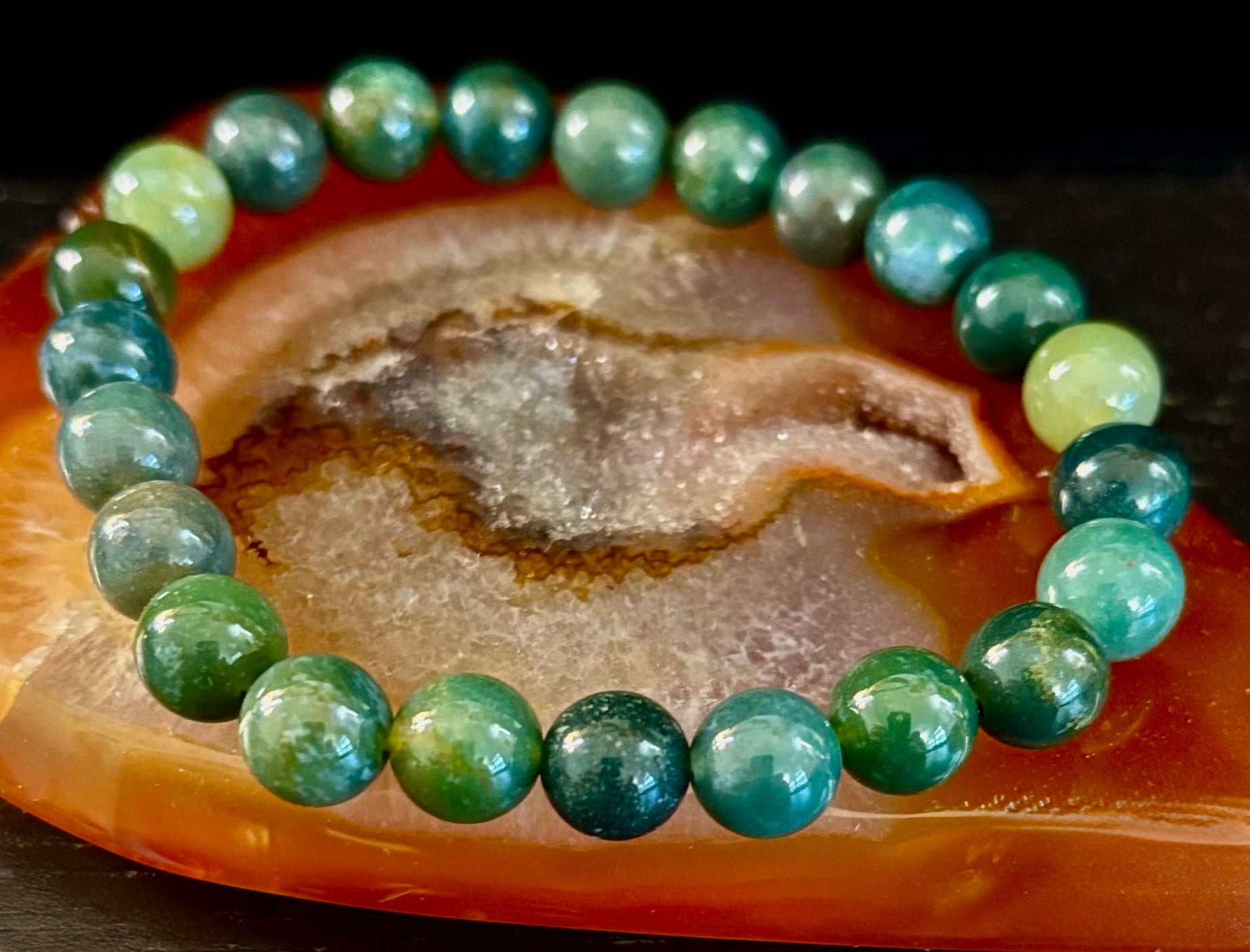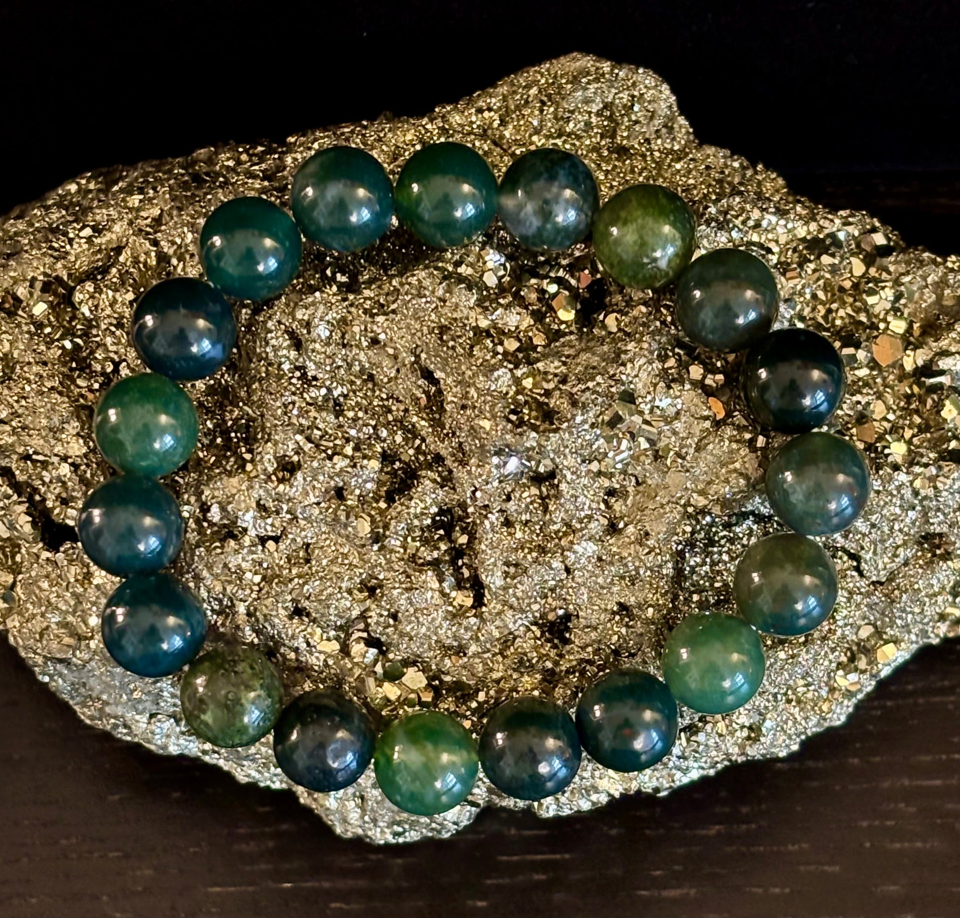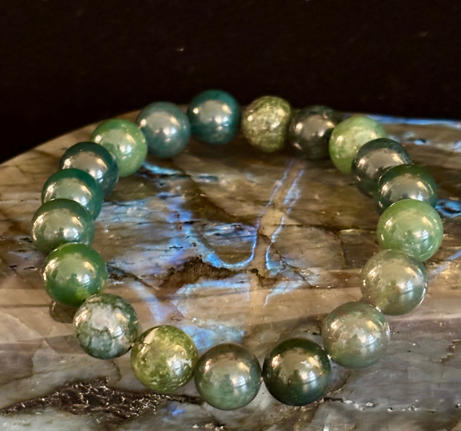Tap into the serene power of the earth with our Natural Moss Agate Bracelet, handcrafted with polished 8mm or 10mm beads that showcase lush forest greens, oceanic blues, and earthy inclusions unique to each stone. Sized perfectly for medium to large wrists, this stretch bracelet is a wearable expression of balance, nature, and inner peace.