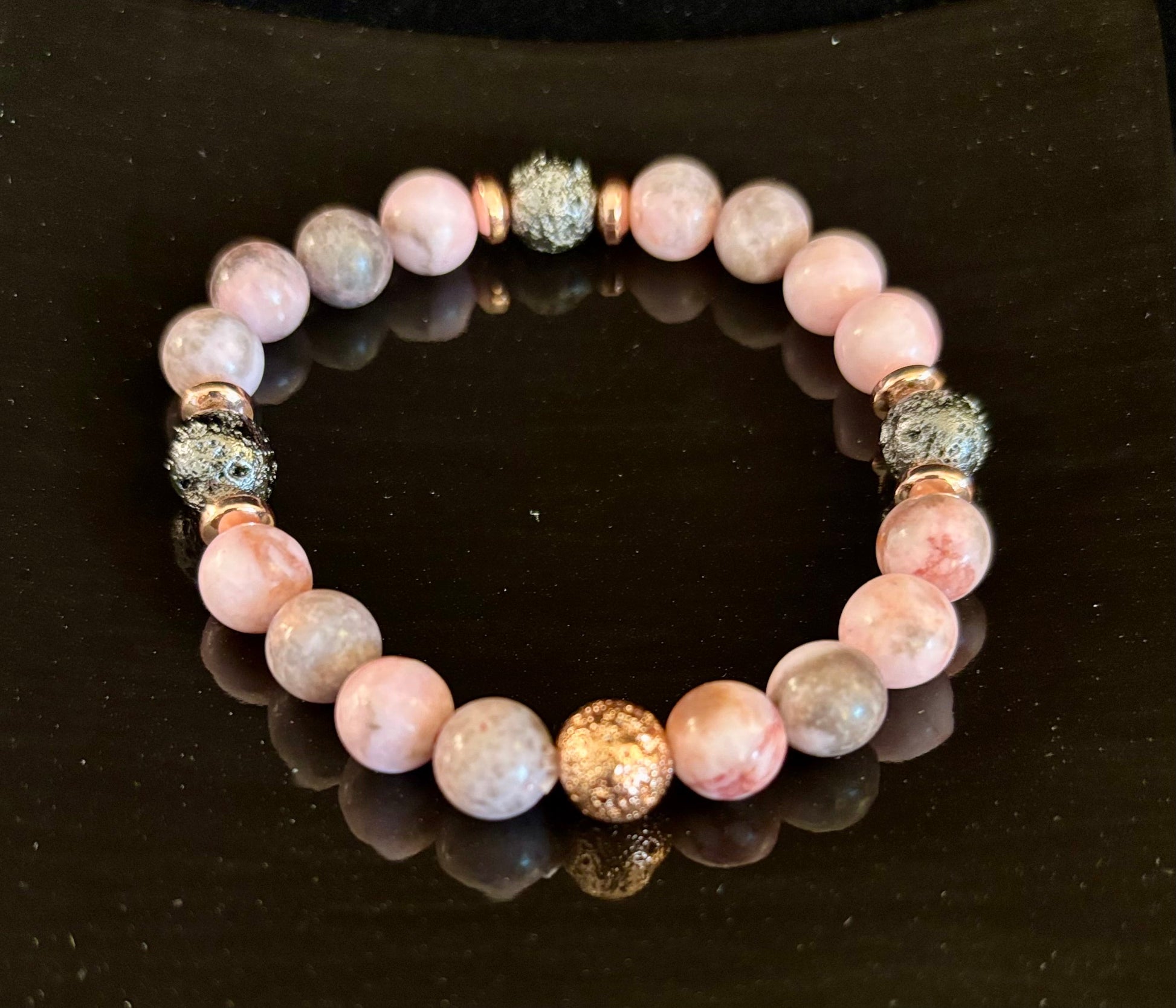Balance your energy with natural beauty in our Pink Zebra Jasper & Rose Gold Tone Lava Stone Bracelet, featuring 8mm beads designed to fit small tomedium wrists with ease and comfort. This elegant, earthy bracelet blends soft pinks, grays, and rose gold accents for a grounding yet gentle look.