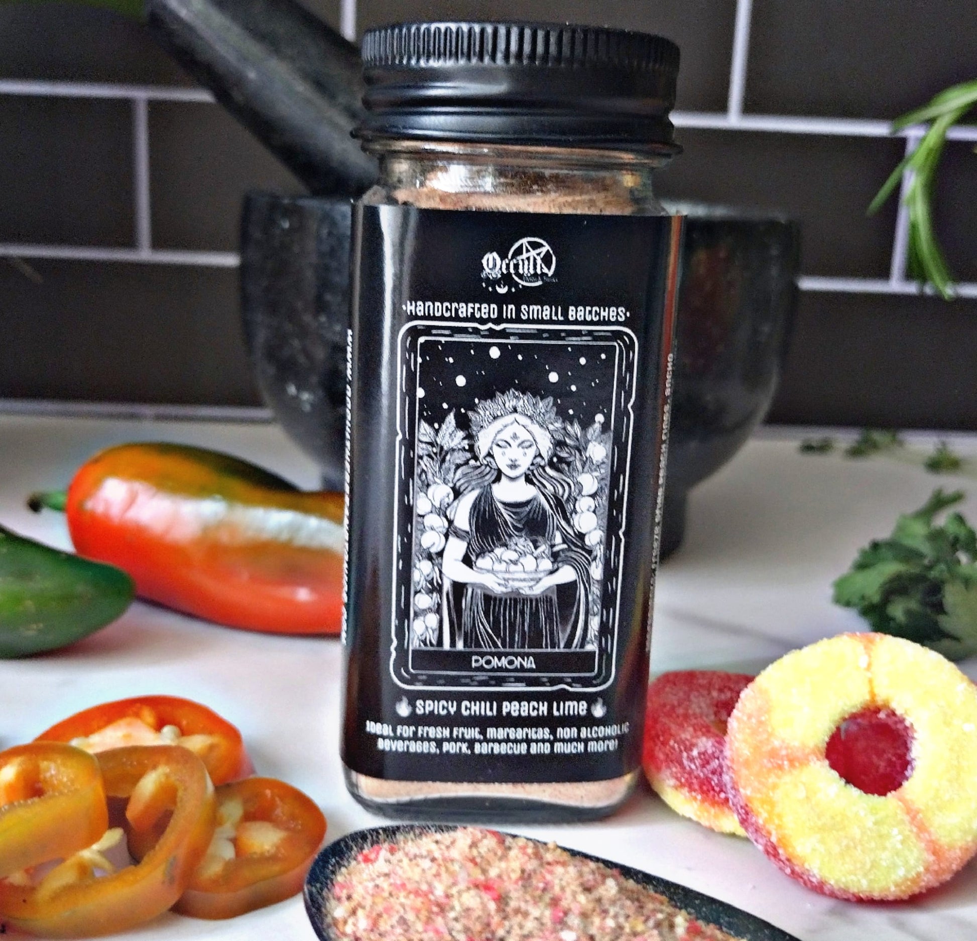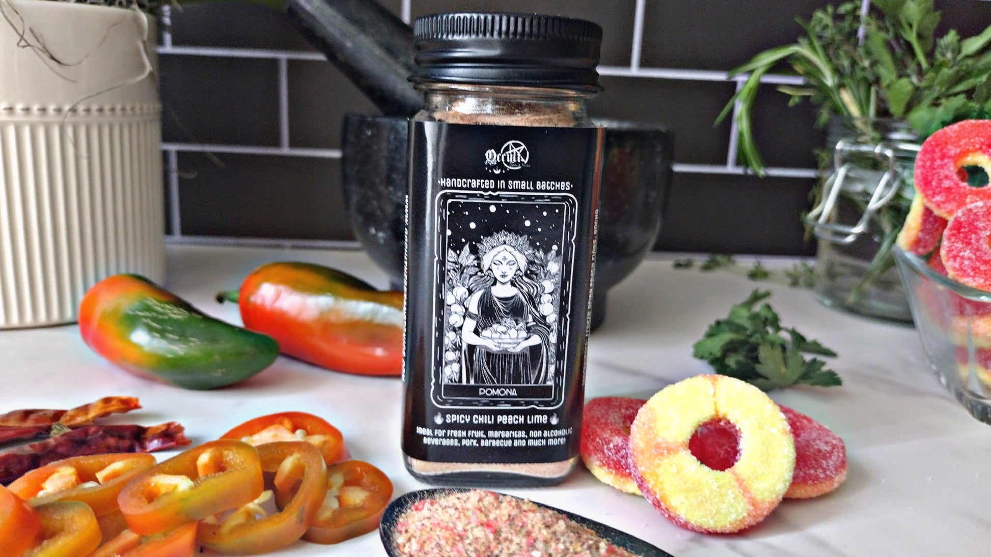 Pomona is a delightful blend of freeze-dried peach rings and three chili peppers (ancho, mecho, and cayenne), finished with a touch of lime. Named after the Roman goddess of fruit harvesting, it offers a fun fruity taste followed by a sweet smoky spiced heat. Perfect for adding a kick to margaritas, barbecue sauce, or a delicious topper on fresh cut watermelon! Grab a jar for yourself and discover the endless possibilities!
