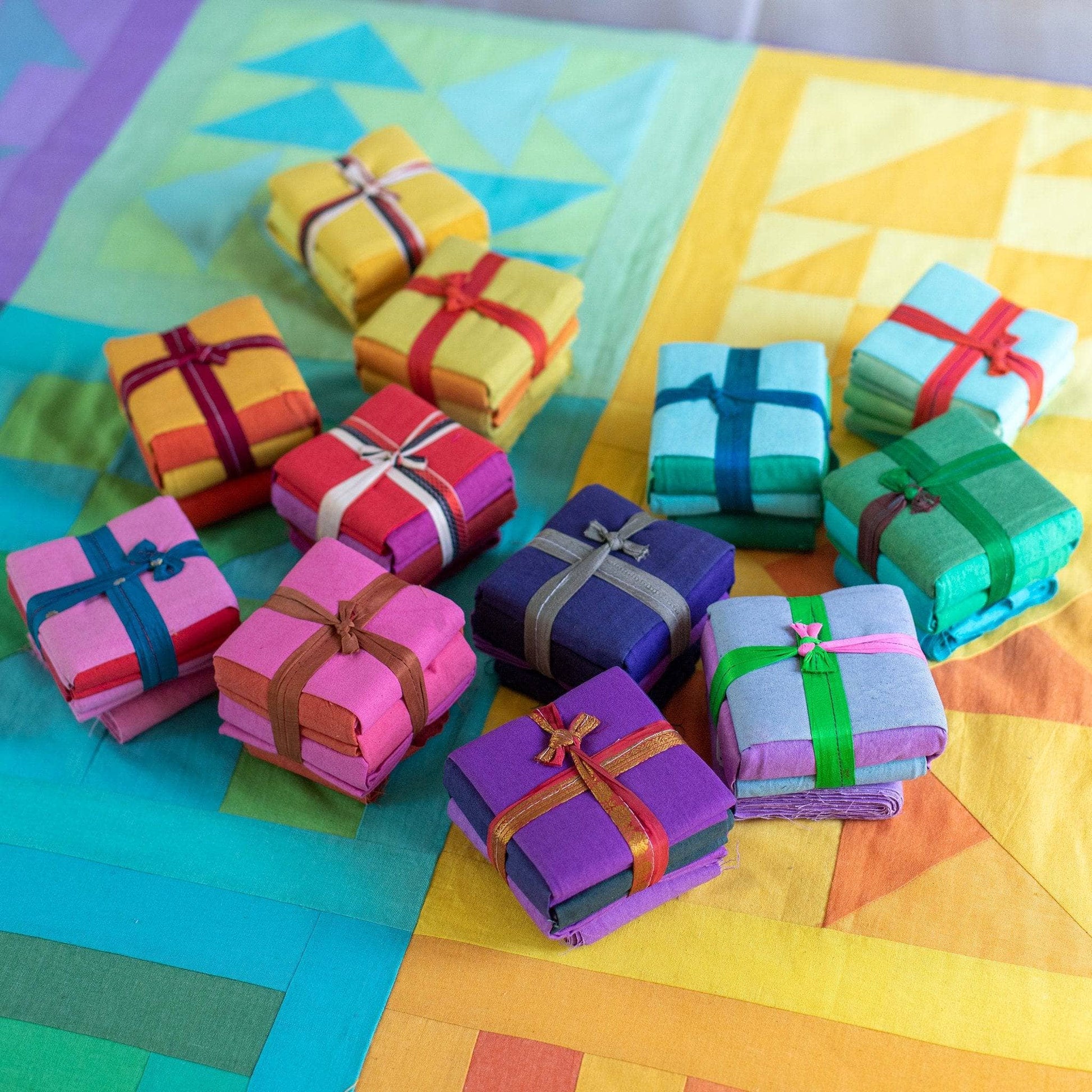 • Comes with all the fabric you'll need, twelve 100% cotton fat quarter packs in solid bright rainbow colors.