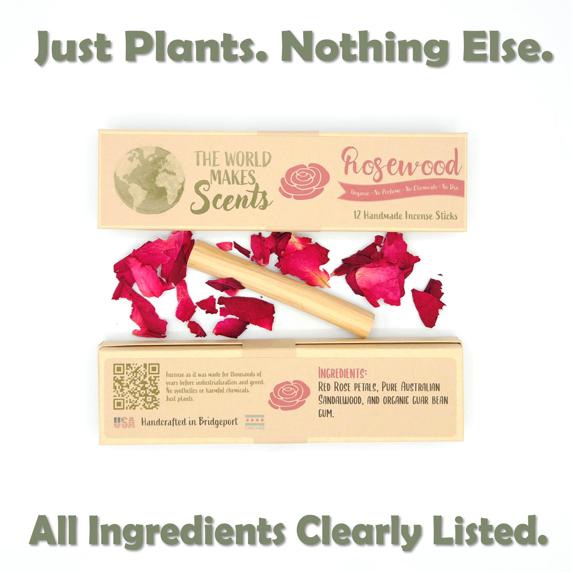You will receive a box of 12 handmade 8 inch long incense sticks on a bed of cotton in a kraft jewelry box. The incense contains no additives. It's made only with plant material.