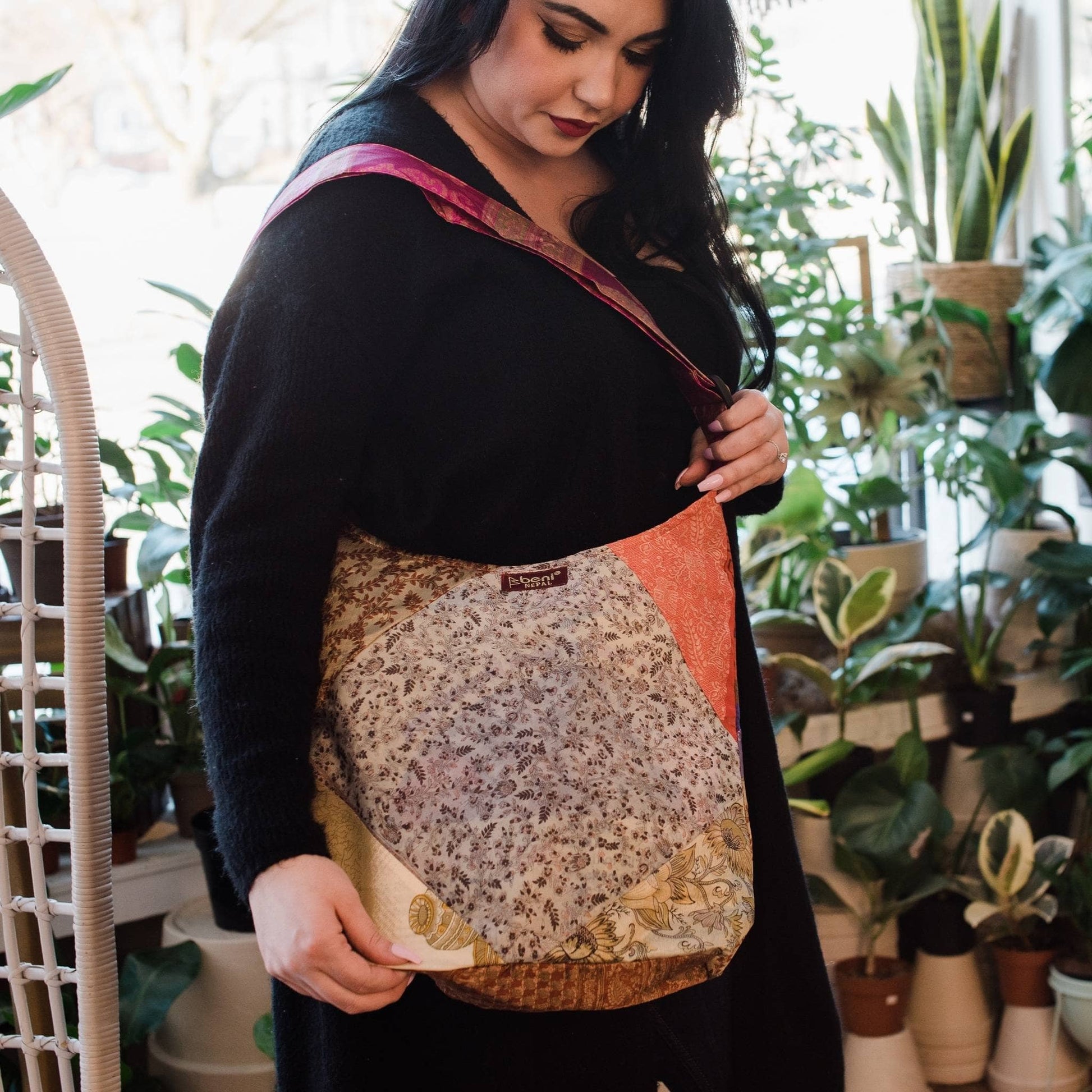 Crafted from reclaimed pieces of vibrant sari material, every purse is a testament to sustainable fashion, offering you a chic and ethical choice for your wardrobe. This spacious bag is more than just beautiful, it's convenient! Room to carry your everyday essentials, this bag also features a pocket for your keepsakes and a zipper for security.