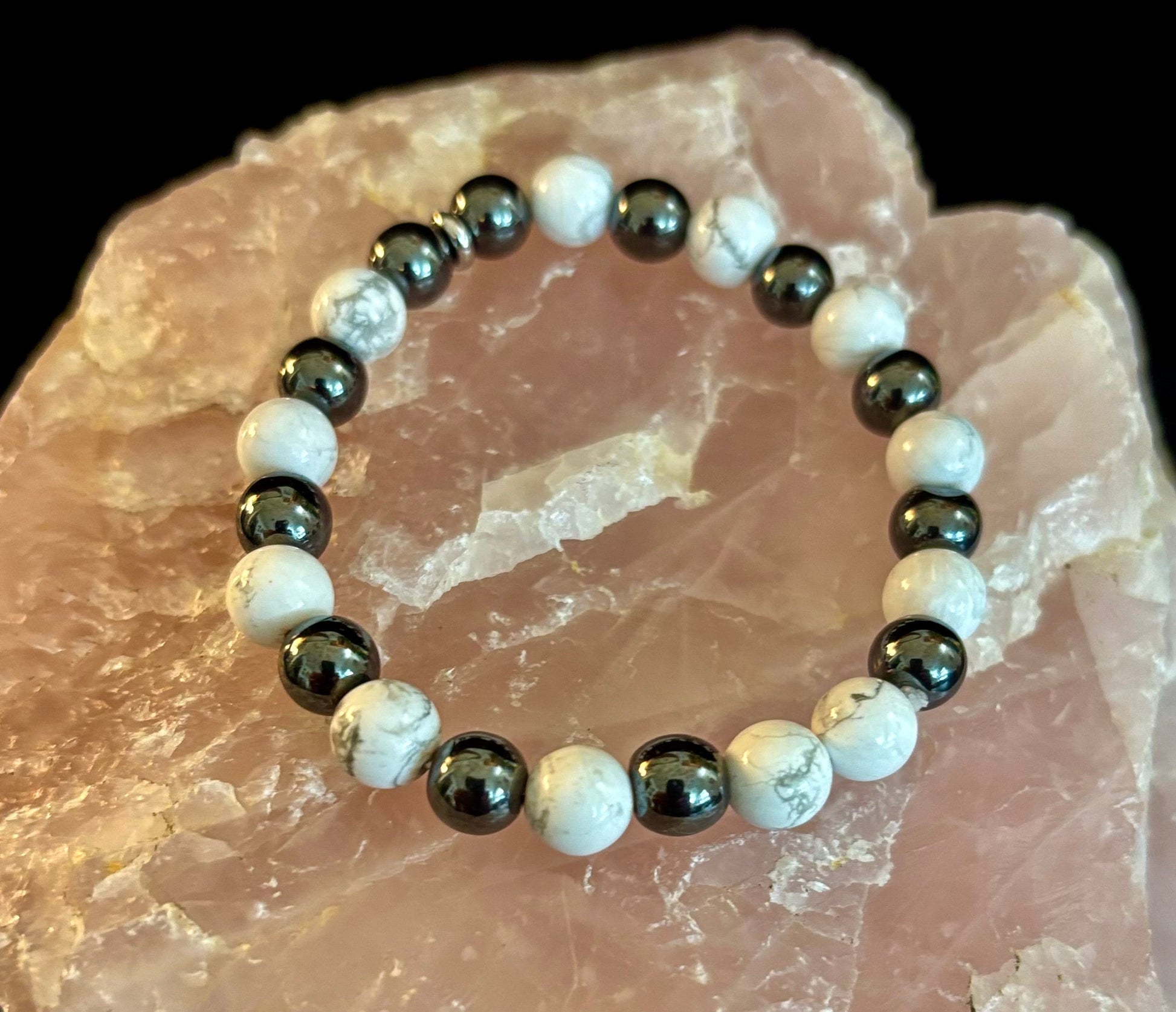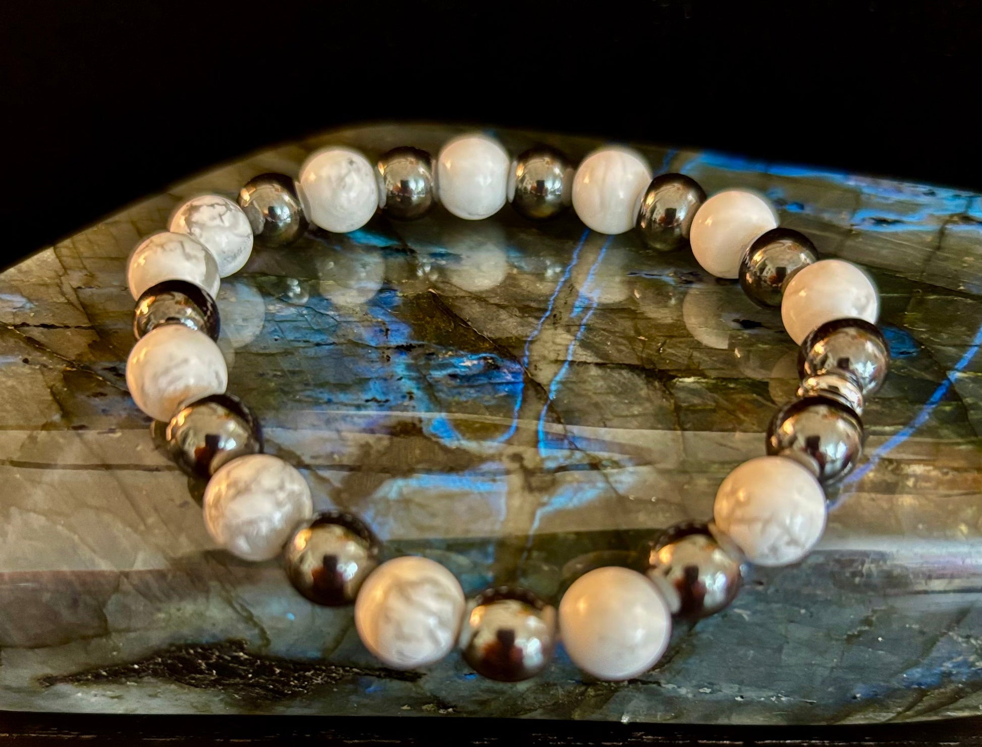 Protect your energy and find your calm with our White Howlite & Hematite Energy Protection Bracelet, featuring smooth 8mm natural gemstone beads. This powerful combination of White Howlite and Hematite offers both emotional clarity and grounding protection, making it an essential accessory for those seeking balance in their daily life.