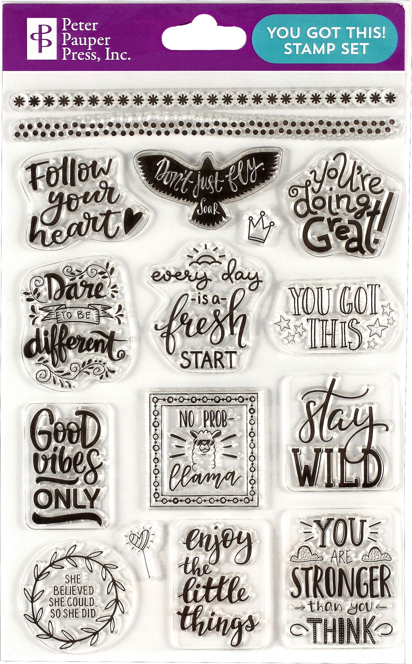 Clear, easy-to-use silicone stamp set is perfect for dot journaling, scrapbooking, and paper crafts of all kinds! Set comes with 16 stamps. Empowering set includes a variety of motivational words and phrases and borders. Premium quality. One sheet of stamps per set. Stamp sheet measures 5-11/16'' wide x 8-1/4'' high. Package measures 6'' wide x 10-1/8'' high.